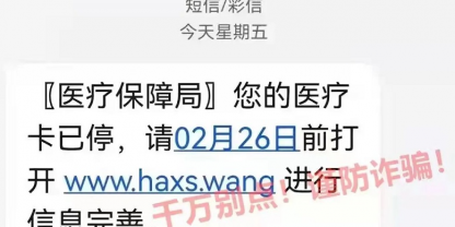 近期有不法分子利用“醫(yī)保停用”等相關(guān)題材,向參保人員發(fā)送詐騙短信,點開鏈接后跳轉(zhuǎn)的頁面與國家醫(yī)療保障局官方網(wǎng)頁非常相似,但內(nèi)含木馬病毒鏈接,如果按頁面上的提示填寫身份證號、銀行卡號...
